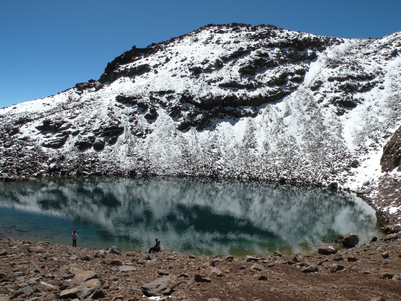 We stopped for an extended snack break next to a snow-fed lake. The guide joked that if anyone wanted fish for lunch, there were trout for the catching. Trout up here? Really? How do trout even get up here?