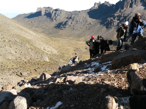 Each hiker would carry only a day-pack to the top and the porters would take the larger packs around the mountain to the next camp. After two days of hiking with a bulky pack, the day-pack felt like a feather. Only four hours to the top, the guides say. Only four hours … and what’s four hours after all? Jon and Wendy wished us luck, and we were off!