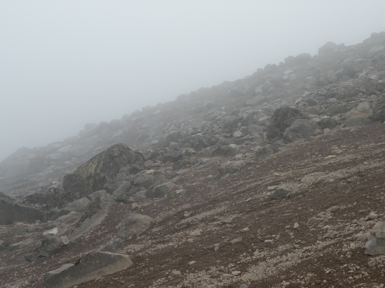 The air was much thinner and the path much steeper, so we stopped to rest about every twenty minutes. Within thirty minutes we had left the low shrub of the alpine zone, and within an hour we hit snow.