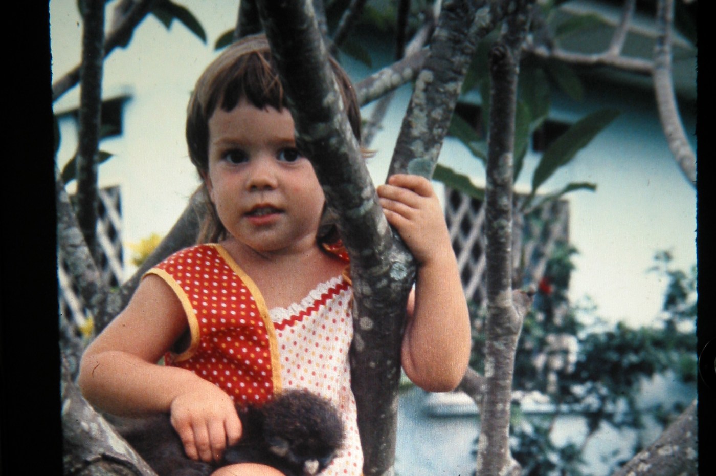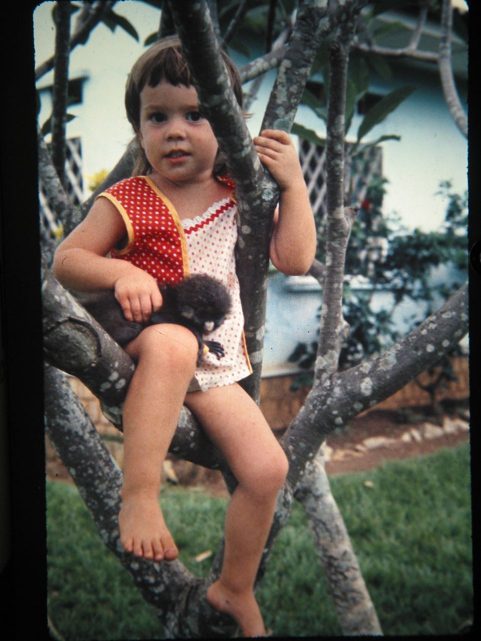 My dad came to visit this weekend. One of the things we did was go through the 10,000-odd photos he has on IPhoto and try to organize them – combine events and delete duplicates. In the process I found a few treasures. Here’s one from when I was 4 or 5 years old. We lived in a small town called Kimpese, (trans: City of Cockroaches) in the south-west corner of what was then Zaire. Not that any of that mattered to me then. The important stuff of life: climbing the frangipani tree with our pet monkey.