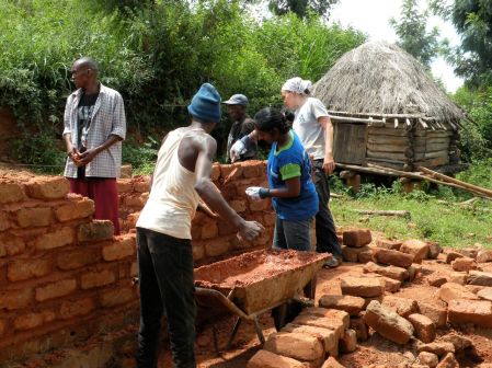 A tent and some plastic chairs had been set up next to a one-room, clay-brick hut. They ushered us into the seats of honour. After a few minutes of welcome speeches and introductions, we set to work: one team went to lay bricks on one house, and the other went to lay the floor slab in another. Most of the work was just muscle: hauling and breaking rocks for the floor, mixing sand and cement with shovels, breaking up the ground with large hoes, shoveling dirt out in wheelbarrows, mixing clay mortar. There were “technicians” available for the slightly more skilled labor such as brick placement.