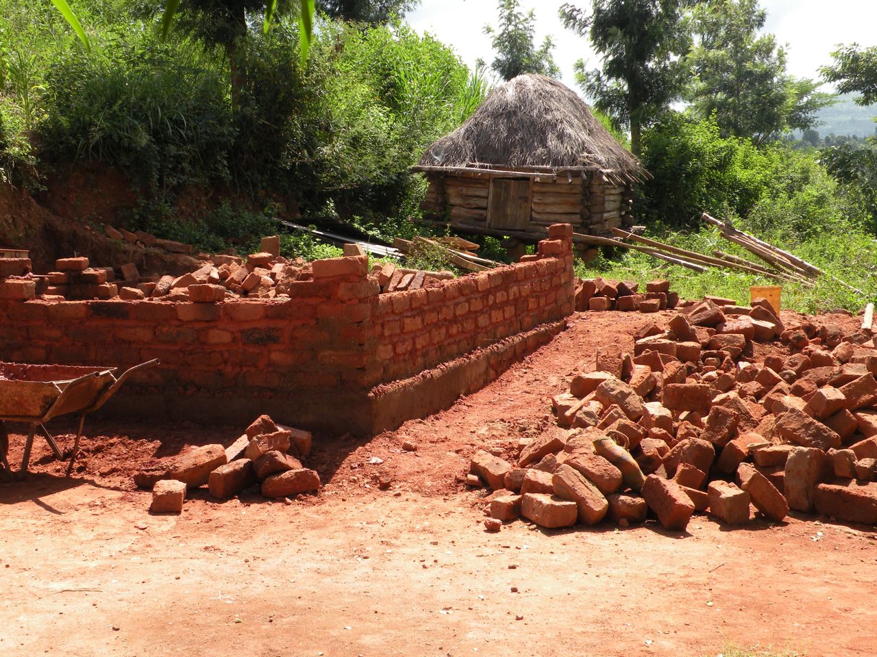 A tent and some plastic chairs had been set up next to a one-room, clay-brick hut. They ushered us into the seats of honour. After a few minutes of welcome speeches and introductions, we set to work: one team went to lay bricks on one house, and the other went to lay the floor slab in another. Most of the work was just muscle: hauling and breaking rocks for the floor, mixing sand and cement with shovels, breaking up the ground with large hoes, shoveling dirt out in wheelbarrows, mixing clay mortar. There were “technicians” available for the slightly more skilled labor such as brick placement.