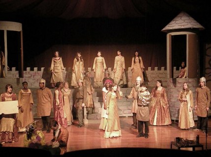 The most recent and most relevant event in my world was the musical production “Once Upon A Mattress.” This year’s musical was a big event. A cast and crew of about 35 kids, lots of music, late rehearsals, rotating turrets, crazy costumes, last minute alterations, water effects, and about a thousand tickets sold for three days of show. My main job on this production was to pull the musical side together. I volunteered in other ways though too. Like set painting. I picked up a brush a couple times and filled in some bricks as a stress reliever. There’s something therapeutic about painting.