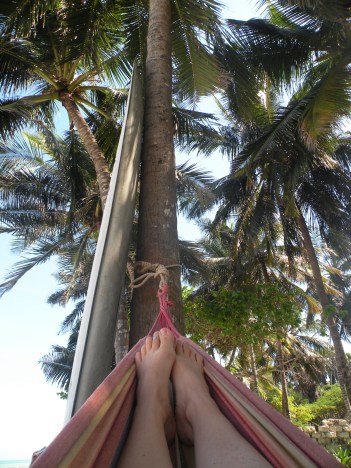 More lazy toes. The surfboard on the side of the tree makes it look like I just got back from a hard morning catching waves. Which could have been true since the hotel where we stayed is actually THE kite-surfing hot spot on the whole Kenyan coast. However … I was actually just being lazy. And the board is actually the kite-surfing sign that faces the beach so that beach-walkers know where to come for the real thing.