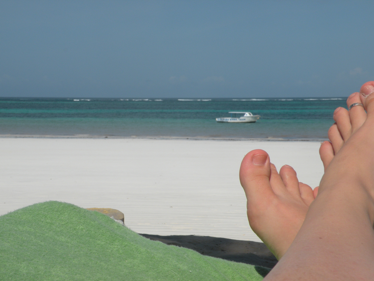 More lazy toes. The surfboard on the side of the tree makes it look like I just got back from a hard morning catching waves. Which could have been true since the hotel where we stayed is actually THE kite-surfing hot spot on the whole Kenyan coast. However … I was actually just being lazy. And the board is actually the kite-surfing sign that faces the beach so that beach-walkers know where to come for the real thing.