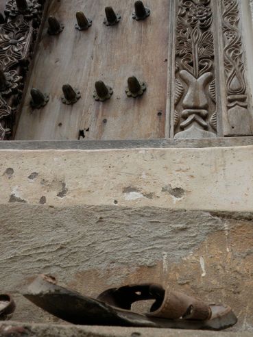 I like the contrast of the worn-out slippers waiting in front of this beautifully carved and fortified door.