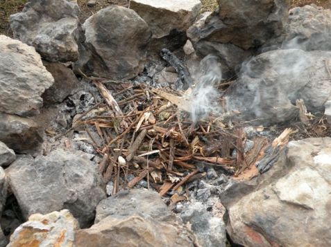 I didn’t take a picture of the fire that we saved with a stone covering. However, I did remember to get my camera for the nifty self-starting fire that happened later. After we came back from a hike, there were still some warm coals in the fire pit. We started to throw in some kindling and the fire decided to start itself. One minute, smoke. The next …