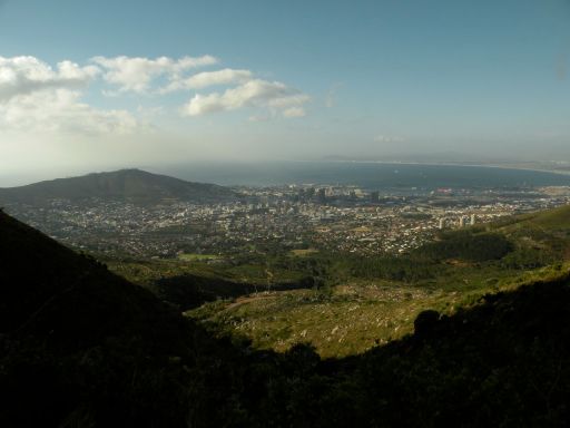 A view of Cape Town city center from part-way up Table Mountain.